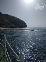 Но мы знали, уже прочитав отзывы туристов, что сразу у выхода в море нам зайти не удастся, т.к. напротив отеля – каменные плиты. Немного пройдя вперёд, мы увидели пирс и галечный пляж, так же с лежаками и навесами. Да так ка мы пришли поздно, то мест свободных было мало, мы нашли один лежак, положили наши вещи и пошли купаться. Море было теплое, красивое. На следующий день мы уже купались с понтона, на нем всегда утром были свободные лежаки и зонтики. А еще если пройти немного дальше к скале, по верху можно попасть на «дикий пляж», нам рассказали о нем как о пляже с необыкновенными видами, как из рекламы Баунти. Побывали мы и там сделали красивые фотографии, были очень довольны прекрасными видами.