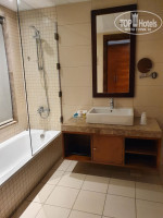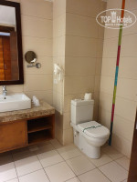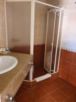 Вообще территория отелей большая, зеленая, красивая. Состоит из основного здания, где расположен ресепшен, лобби бар и главный ресторан, нескольких 3-х этажных жилых корпусов и много бунгало. Бунгало раскиданы по всей территории, состоят из 4 номеров (каждый с отдельным входом) и не имеют балкона. Столик и стулья, которые обычно стоят на балконе, в бунгало просто расположены на улице рядом с входной дверью. Чтоб выйти вечером посидеть на улице, нужно, как минимум, что-то одевать и народ постоянно ходит. Не наш случай. Сам номер в бунгало на наш взгляд какой-то темный и маленький. В ванной угловая душевая кабина, ванны нет.