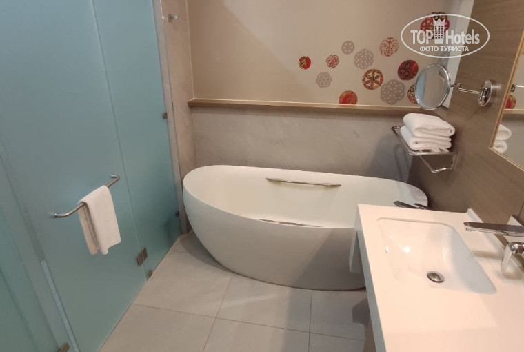 Номера: кто-то в отзывах жаловался на поцарапанные полы и стены. Ну, очевидно, это не горничные на коньках катаются, а горе-лыжники шлепают по паркету в ботинках и задевают лыжами стены - других предположений у меня нет. Зато и мебель, и сантехника - отличного качества. За матрас, душ и ванну ставлю твердые 5*, а я очень избалованный в этом плане человек. Кондиционер (точнее, климат-контроль) - абсолютно бесшумный, и поток воздуха направлен не на кровать, а это очень важно. Казалось бы, очевидная вещь, но в 50% российских отелей тупо вешают кондиционер над кроватью и считают, что так и надо.