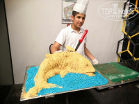 Обед и ужин, это фантастика. Многообразие блюд из рыбы, мяса, птицы. Здесь я первый раз попробовала тунца запеченного в соли, это божественно вкусно. Мясо на углях. Приготовление блюд по вашему желанию, тут же при тебе. Салаты, овощи, зелень, фрукты, ягода, мороженое, десерты, торты мммм. Порции всегда достаточно большие, очередей в ресторане нет. В ресторане напитки местные, в баре предлагают так же импорт. Обслуживание в ресторане очень вежливое, не навязчивое.