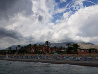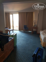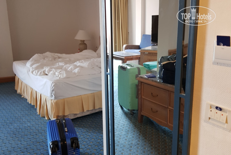 Мы доплатили 50 долларов и заселились в номер категории повыше, очень большой, чистый, с большим балконом. Двуспальная кровать, тумбочки, комод, диван, столик, телевизор, туалетный столик, шкаф, бесплатный мини-бар, ванна, сейф, сушилка на балконе, в принципе для комфортного проживания все есть. Вид у нас был на море и часть бассейна, при закрытых окнах шум не сильно слышен, да и так все развлечения заканчивались в 00.