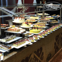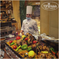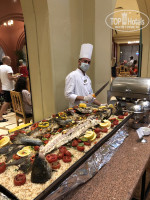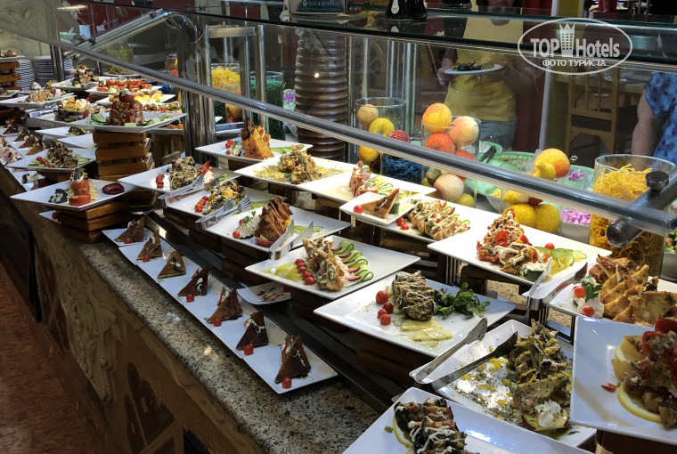 Как много писали в отзывах ресторан - столовка с толпами, а под занавес начала првращатся в советскую. Такое ощущение что все, что не было сьедено на кануне, повара красиво (ничего не скажешь!) оформляли в виде рулетиков и прочих комбинаций. Но все это для тех, кому мясо не нужно. Из мяса была только говядина плюс минус одинаковая, пресная и волокнистая. А также курица/утка. Плюс иногда жарили на гриле люля и вкусные котлеты у гамбургеров, которые давали иногда на обед. В основном ресторане это Всё!(