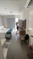 В номере есть сейф, холодильник (2€ в сутки каждый), шкаф с вешалками, столик внутри и снаружи на балконе со стульями, посуда, приборы и микроволновка (!), чайник, фен (расположен в ящике под зеркалом в комнате), телевизор с несколькими русскими каналами. В ванне набор мыльно-рыльных принадлежностей: гели, шампуни, бальзамы, мыло. Мы не пользовались, но они постоянно пополнялись, и под конец отдыха была уже целая коллекция :)