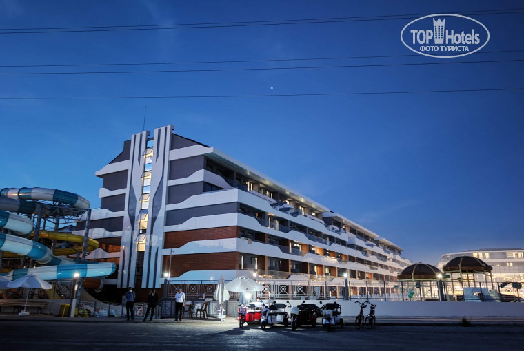 Территория очень компактная, но все продумано. Вдоль большого бассейна располагается ряд баров, ну и конечно наша любимая точка с мороженым (перепробовали все, а это порядка 20 видов, только в шариках + в упаковке, наверное столько же) . За бассейном расположен детский аквапарк, с тремя горками (мы не пользовались т.к. вода в нем была очень холодной ). Справа от детского, расположен взрослый. Вот этим очень даже пользовались. Перепробовали все 6 горок, мои любимые желтая и оранжевая )). За зданием, детская площадка с горками и качелями. Слева от детского аквапарка расположена сцена на которой каждый вечер проходили отличные шоу с приезжими артистами. Ну и лунапарк с 5 аттракционами и батутом.