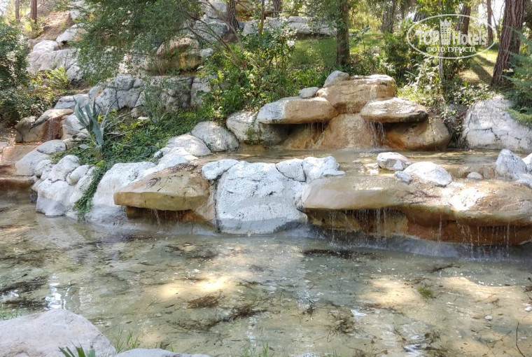 Отель-лес, отель-сад. Все деревья пронумерованы и находятся под постоянным присмотром. Дорожки обрамлены аккуратно подстриженными куртинами или украшены фигурно оформленными деревьями и кустарниками. Есть даже пара небольших «огородиков» с растущими пряностями полутора десятков видов. Справа от ресепшен, по направлению к Кемеру, территория Кимерос Парка ограничена забранным в камень и бетон руслом горной реки, частично заполненным морской водой. На другом берегу находится соседний отель Гхазал Миароза Резорт, значительно меньший по площади. Сосед с другой стороны, столь же небольшой Перре Арт (б. Отиум Арт, б. Ларисса Арт).