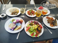 6. Питание. *Есть основной ресторан (из алкоголя там вино и пиво на обед и ужин), безалкогольные напитки, кофе, чай, горячий шоколад. Меню достойное, но из морепродуктов было только два вида недорогой рыбы. А так ждали креветок! Много зелени, однотипных салатов. Мясо - курица, индейка с овощами, пару раз - баранина на гриле. Картошка фри и дольками, вкуснейшие луковые колечки были почти ежедневно. Жарились при нас. Свежие лепёшки, овощи гриль, супы, сладости практически 3-4 видов, но из-за ярких красителей казалось, что их около 15 наименований. Утром - турецкие булочки с разной начинкой, стандартный омлет и яйцо. Были спагетти без добавок. Видимо, для деток.