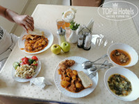 Завтрак и обед превосходно, прям по- домашнему. На завтрак: чай-кофе на выбор, сосиски, макароны с мясом, омлеты, сырники, запеканка творожная (каждый день все новое) , пицца (один раз была), булочка, два вида каши, ветчина, колбаса, сыр и масло (ежедневно). На обед: два вида гарнира, что то мясное, жаркое было, два супа, два вида салатов и компот. Яблоки ежедневно.