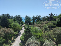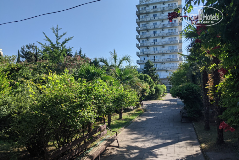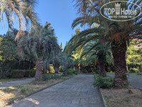 У пансионата большая, очень зеленая территория, но запущенная. Очень жаль, когда-то это был ботанический сад. Плитка на дорожках выщербленная, потрескавшаяся. Все спортплощадки в нерабочем состоянии.