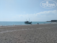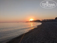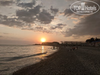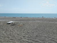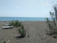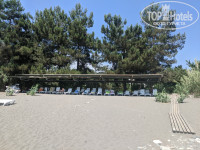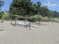 Широкий протяженный пляж, есть навес, окруженный зарослями бамбука, а также навес из маскировочной сетки, почти не дающий тени. В этом году закуплены лежаки, 40 из них привязаны под навесом, еще 45 отдыхающие таскают к морю, а спасатели вечером собирают в три стопки и привязывают. Пляж серый песок и галька, заход в море резкий, по крупной гальке. Море было переменчивое, периодически сильное течение, вода то теплая, то слоями, то совсем холодная. Море было мутное, несколько раз приплывал мусор, бытовой — пластиковые бутылки, пакеты и т. п., а после грозы и ливня ветки и коряги, видимо, принесло впадающей в море неподалеку большой горной рекой Бзыбь. Душа на пляже нет, только краны для мойки ног по дороге к корпусу. Кабинки для переодевания так странно устроены, что одна из них полностью просматривается с дорожки, ведущей на пляж. Две другие, правда, прикрыты кустами. Если территорию пансионата ежедневно убирают дворники, а мусор на пляже собирают и жгут на костре спасатели, то мусор вокруг кабинок лежал, видимо, с начала сезона, и при мне так и не был убран, хотя я дважды просила об этом на рецепшн.