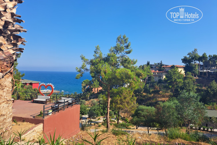 Начитавшись ужасных отзывов от недовольных постояльцев, Я ничего хорошего не ожидала. Я выбирала отель по принципу - много зелени и пляж без волн. Отель расположен на горе среди парка. Многие его называют "отель заповедник" или "отель- дендрарий", что в общем-то правда. На территории много цветов, кустиков, пальм и разных деревьев. Вокруг моего домика растет инжир, мандарины, гранаты, оливки, виноград, у домика растет мята и яркие южные цветы. Вчера гид, пока мы ехали в отель, рассказывала про эти цветы легенду. Они ядовитые, и если турчанка изменял муж, то она в качестве предупреждения клала цветок ему на стол. Если муж не внимал предупреждению, то цветок уже заваривали в чай.