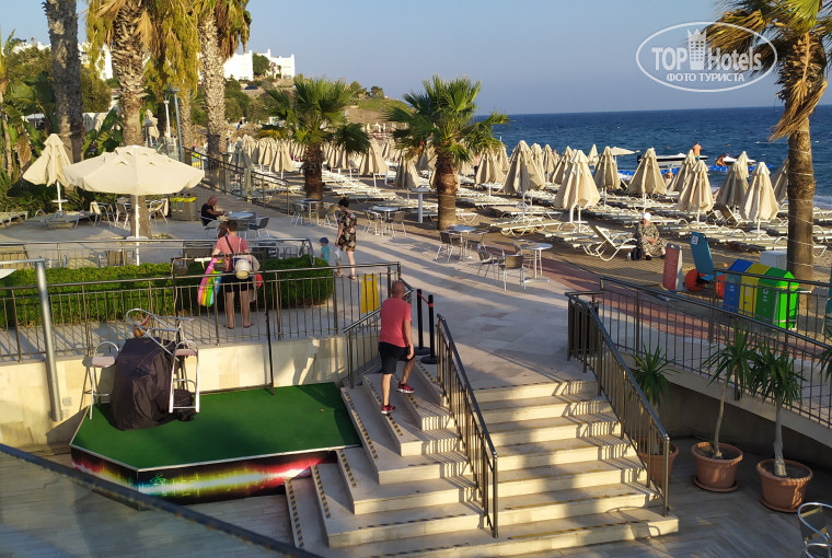 Дочь решила сделать мне подарок в виде отдыха в Бодруме. Сразу скажу: данный отель не находится в Бодруме, до города почти час езды на машине, а этот отель находится на отшибе, село(кишлак, деревня) за пределами отеля выйти не куда, Очень высокая влажность, очень. Бельё сохнет по два дня. Поэтому постель влажная. Через два дня в ванной появился запах КИСЛЯТИНЫ. Еда мерзкая, "здравствуй гастрит".Напитки - резкий суррогат, натуральный сок( здесь это понятие отсутствует напрочь) , химозный юпи, во что вас ждёт. Анимации нет. Для детей нет ни программы, ничего. Море холодное, волны огромные, плавать только со спасательным жилетом. Я лично спасла пожилого мужчину, он не мог выйти из моря,так как его отбрасывало волной назад. На спасателях здесь тоже экономят. Здесь вообще на всём экономят. Когда покупаешь тур, всё говорят Элитный отдых. Представитель турфирмы при встрече на инструктаже" Бьёт себя в грудь" и говорит нам,что как нам несказанно повезло попасть на ЭЛИТУ. НУ, если вы в жизни ничего кроме как говна за баней не видели, тода,этот отель-элита.Посуда грязная, это факт. Деньги жаль, как же жаль потрачено деньги. Ехать на самолёте, потом 3,5 часа тряслись на машине. И купаться в бассейне с хлоркой. Тип здания бунгало, номера маленькие тесные. Пять звёзд, максимум 1 . Номер убрали, только когда неоднократно мы попросили. В уборку вошло помыла полы, сменила наволочки , покрывало, полотенце, это на третий день прибывания. Туалет душ и простыни остались в том же состоянии. На официальном сайте была указана информация о том что персонал отеля владеет английским, турецким и русскими языками. Подходим на рецепшн, а русскоговорящих у нас тут немаа, (он потом придёт....), 10% обслуживания разговаривают на английском. Столкнулись с руссофобией не со стороны проживающих иностранцев, а с обслуживания в той же самой столовке. Парень стал что то говорить на турецком (если бы знала что здесь курируется только турецкий, выучила бы хотя-бы разговорный-но умная мысля приходит опосля) на что я ему отвечаю I don't understand (я не понимаю) на что тот с турецким акцентом процедил я нэпонимаю по русски отмахнулся от нас. Вследствие этого никто после этого с нами не разговаривал и мы были представлены самим себе.