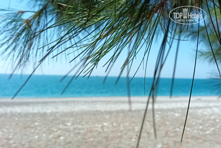 Пляж порадовал, широкий, море очень чистое, вход мелкая галька. Удивило минимальное - штук 40 - количество лежаков на весь пансионат, при том что заполненность отдыхающими полная. Кто вставал в 5-6 утра тот и отдыхал ежедневно на лежаках. Все остальные на камнях. Мне лежак не достался ни разу:) Ходила налево на дикий пляж, отдыхала там в тени сосен.