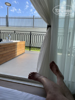 Отель: новый, современный дизайн, хорошие материалы, но видать наспех делали Джамшуты. Много недоделок, где то швы на плитке, двери в душе не закрываются плотно, у нас фен отвалился от стены, висел на проводах. Обратились на «репу» чтобы починили, сделали на день 2-3. Номер двухкомнатный, 2 большие кровати, 2 душевые, 2 туалета, 2 раковины и 2 фена – что для нас было очень удобно! Номер на -1 этаже, на этом же этаже общий ресторан. Джакузи на балконе, работал хорошо, что очень удобно после дневного загара и соленного моря, вечером полежать в приятных пузырьках с пеной и бокалом холодненького – супер кайф. Приватный сад (приват гарден) – ну садом это сложно назвать, просто газон размером метр на метр и забор на улицу. Балкон выходил на задний двор, нам не было видно самой улицы, т.к. этаж углублен. Плохо одно, стены вроде между номерами на балконе есть, но не в потолок, т.е. слышно соседей которые тоже решили понежиться в джакузи, в один вечер, в соседнем джакузи девушка отрабатывала подаренный её парнем ноутбук)))) Было весело. Слышимость с улицы хорошая. В номере мини-бар, пополнялся каждый день пивком, соками, колой и водой, чайно-кофейный набор. Есть чайник и кружки. Набор полотенец был полным, для всех частей тела, чистые новые. Тапочки были стрёмные, одноразовые, только под конец отдыха положили махровые. Моющиеся средства пополняли не всегда, как то через раз. Одеял нет, есть покрывала, но мягкие и комфортно было под ними спать. Если хотите-вам принесут одеяла. Уборка номера…. Это «боль» отеля! Уборка просто отвратительная, т.к. ремонт был сделан наспех и не качественно, везде строительная пыль, за все 10 дней полы не мыли ни разу, оставляли чаевые – не решают проблему! Хаус-кипинг нужно менять срочно или обучать. По ТВ есть российские каналы.