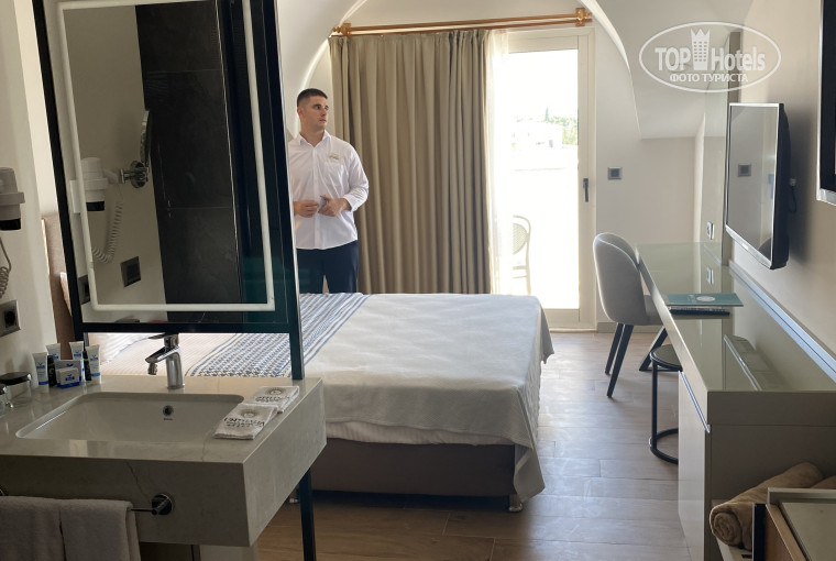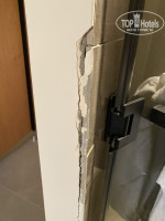 4) номера маленькие, пока все в стадии доработки. Нас заселили в номер без двери в ванную, поставили ее в течение 4 дней. Также добавили диван в конце отдыха и рамки для розеток. Из-за неправильной установки дверей, люди просто, открывая дверь в туалет, сломали керамогранит уже в новом отеле. У нас посыпалась Штукатурка и пошли трещины из-за этого (фото прилагаю). Если ехать с детьми, то не очень будет комфортно в номере эконом, там когда выходишь из душа, будет тебя всем видно, разделяет комнату только раковина с зеркалом. Нас это с женой не напрягало.