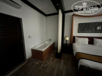 В номере: большая кровать, кресла, прикроватные тумбы, стол, светильник из кокоса (мелочь, а приятно), телевизор, холодильник, чайник и чайный набор; гардеробная с большим зеркалом, ванна в комнате; отдельно санузел с душем, раковиной, унитазом. Замечание по санузлу: нет поддона/уклона/бортика возле душа, то есть когда моешься под душем, водой равномерно заливает весь пол в ванной, после чего вода не уходит, а продолжает стоять лужей до прихода горничной, по всей видимости. Это очень неудобно! Старые-страшные б/у тапочки предлагаются гостям (спасибо, мы со своим), можно было бы дать одноразовые. Мыльно-рыльные предоставляют, также дают одноразовую расческу и зубные щетки. Есть фен. Wi-fi в номере не ловит, нужно идти или на ресепшн, или в зеленую зону, или к бассейну. На территории очень тихо, малолюдно. Бассейн не очень большой, показался чистым на первый взгляд, но мы не купались; есть несколько шезлонгов рядом с бассейном и столы с зонтиками.