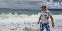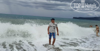 Пляж минут 5 ходу. берег понравился. мягкий. можно босиком. глубина сразу. большая и веселая анимация от соседнего Куина. волны тут постоянно. виден Кемер. Горы обворажительные.