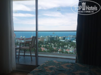 Новое здание 2020г, всё функционирует. Отель на возвышенности - море видно из большинства номеров. И он вплотную к трассе - её слышно в первых шести номерах. При открытом балконе в четвертом номере это создавало для меня "белый шум" и убаюкивало. Из-за формы здания волной (два полукруга) номера трапециевидной формы. С 1 по 9й расширение к балкону (эти номера ближе к дороге), с 10 по 17й сужение. На мой взгляд, лучшие номера с 5й по 9й: и дорогу уже не так слышно, и балкон широкий.