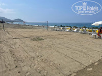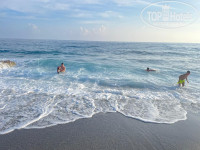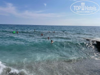 Море соленое, бархатистое (кожа после него мягкая), очень красивого бирюзового цвета, очень чистое. Я думаю, это благодаря отсутствию горных рек и судоходства. Заход в море - прорублен специально для отдыхающих в природной каменной плите. Результат - комфортно, удобно. Песочек темный. Участок пляжа, принадлежащий отелю, благоустроен: деревянная дорожка к морю, нормальные лежаки, нормальные матрасы, душ, кран для ног, переодевалка, бар, туалет, площадка для волейбола. Туалеты благоустроенные удобные, чистые, периодически ароматизируют. На площадке для волейбола по утрам ровняют песок. На пляже имеется спасатель, свистит когда волны слишком большие.