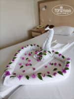 3. НОМЕРА. Номер у нас был стандартный с балконом на 3-м этаже. Балкон наш был весь в зелени и цветах. Номер среднего размера, аккуратный, чистенький, кровати, тумбочки, стол, зеркало, мини-холодильник с б/а напитками, телевизор (1 русский канал, показывал плохо), шкаф для одежды, вешалок достаточно. Санузел современный, душевая кабина, но из мыльно-рыльных только мыло и гель д/душа. Шампуня и бальзамов нет, берите с собой, и у фена очень горячий воздух, мне не понравился, но я тоже брала свой. Полотенца хорошие белые, меняли каждый день, несколько раз меняли постельное, уборка нормальная тоже ежедневно, независимо оставляли чаевые или нет. Большой плюс был в том, что у нас не отключался свет, когда мы уходили из номера, и можно было оставить включенным кондиционер. И потом прийти в прохладную свежую комнату. Из минусов для меня - плохая шумоизоляция от улицы. Я сплю чутко, часто пользовалась берушами. В соседнем отеле очень громко под утро кричал павлин и шум от дороги был слышен, хотя она и небольшая совсем. Но кто спит крепко, ничего не слышали.