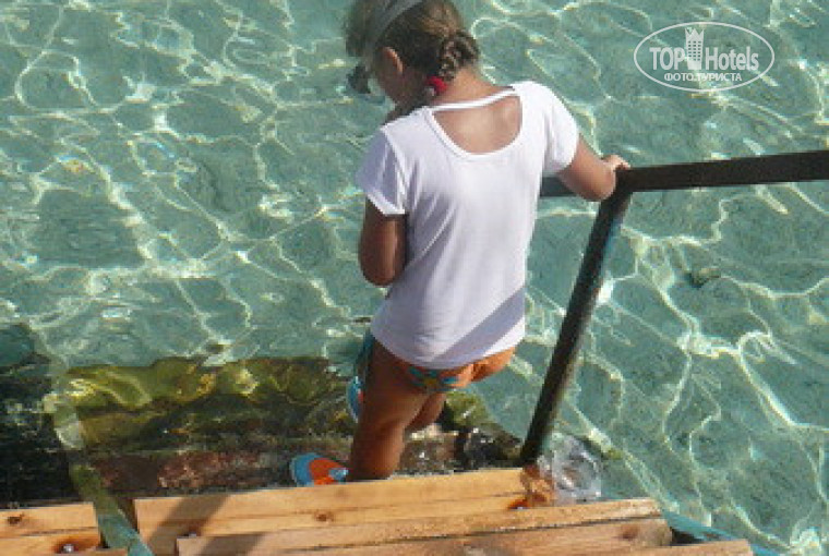 1. Понтон-800 метров, примерно на половине расстояния есть маленький "загончик"-там песок, много маленьких рыбок, прозрачная вода, недалеко коралл с живностью (мурен там видели)-идеально для детей и не умеющих плавать. В конце понтона, там, где заканчивается риф-СПУСКИ С ПОНТОНА СЛОМАНЫ. В более-менее приличном состоянии только одна лестница-скользкая и на которой всегда толпа народа, особенно после 12-когда все позавтракали и пошли купаться. При мне женщина там сломала ногу, её вывозили оттуда на мопеде наверное два часа спустя. И эти два часа она под палящим солнцем "загорала". Мы были с 7-летней дочкой и всегда очень проблематично и страшно было там спускаться, а всегда купаться в "загончике" на мели тоже неинтересно-не за тем ехали.Отдельно скажу-коралл красивейший и живности там мега-много! От этого мы были в восторге. Но чтоб там поплавать, надо сначала туда спуститься, пролезая через толпу и держась зубами за воздух. Кстати, у соседнего отеля нет понтона и они ходят на "наш"-представляете там "час пик". И коралл-это не заслуга сотрудников отеля.