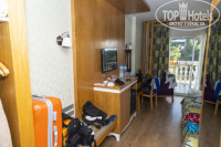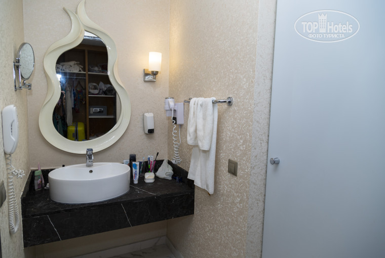 Сначала расскажу про номер. У нас был номер на втором этаже №230 (для меня по факту, если смотреть с улицы у бассейна, то это 5 этаж). В номере была большая двуспальная кровать и раскладушка для сына. В шкафу есть много вешалок. Также в номере есть стол, телевизор, стул, кресло маленький круглый столик, минихолодильник (в нем простая и минеральная вода пополняется бесплатно каждый день кроме четверга). Сразу, что удивляет в отеле 5*, это то, что нет одноразовых тапочек и различных гелей, и шампуней. В дозаторах у раковины и в душе есть жидкое мыло. Многие пишут, что туалет без двери, но это не совсем так. Вход к раковине из коридора действительно без двери. Далее справа туалет со стеклянной непрозрачной дверью. Слева от раковины душевая за шторкой. Каких-то неудобств это нам не доставляло.