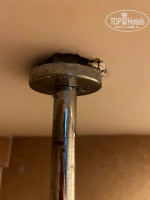 - душ, который вмонтирован в потолок, держится на честном слове. При прикосновении к нему осыпается штукатурка; - пол в душевой комнате, на котором лежит песок.