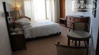 Номер чистый, на мой взгляд очень симпатичный, огромная кровать, столик с двумя стульчиками, отдельное кресло с подставкой под ноги, две тумбочки, большой комод и над ним телевизор, довольно большой. Так же в коридоре находится зеркальный шкаф, внутри шкафа у нас были: утюг и гладильная доска, тапочки, халаты. Имеется так же мини-бар, есть чайник, кружки, стаканы, в баре бесплатная вода, пепси и фанта (лимонады если кто не знает оплачиваются отдельно). Есть пакетики с чаем/кофе, сливки сухие, сахар. Приятно удивило, что в номере есть две раковины (одна находится снаружи ванной комнаты, напротив нее женский столик и небольшая сидушка), вторая внутри ванной комнаты, имеется туалет, биде, полотенца, наборы для душа, мыло, лосьон для тела, шапочки для ванной. Обращаю внимание, что есть номера с душевой кабиной, а нам достался номер с ванной, так вот где имеется ванна шланг для душа не предусмотрен, лейка торчит из стены, высоко (по необходимости номер могут без каких-либо проблем заменить, нам предлагали т.к. у меня низкий рост, но мы отказались, молодой человек был высокий, помогал регулировать). Балкон очень большой, имеется столик и пластиковые стулья. Мебель может и не самая новая, но, аккуратная и без каких либо заметных повреждений, нам было комфортно. Вид с балкона потрясающий, видно море и горы, этаж был 4ый. МИНУС НОМЕРА: очень шумит кондиционер, если не включать - естественно жарко, причем кондиционер направлен на кровать, можно легко заболеть, будьте осторожны, возможно, с кондиционером можно что-о придумать, охлаждает помещение хорошо, но шум и направленность на кровать не очень. В номере так же плохо работает вай-фай, почти нет связи, на ресепшене связь идеальная. Уборку проводят хорошо, песка нет, полотенца и постельное белье меняют как положено, но, пару раз нам не положили воду и мыло, стоит лишь подойти раз к уборщику и сообщить об этом больше проблемы не возникает (уборку проводят мужчины). Сантехника так же неплохая, обычная) В целом номер уютный, светлый, крепкая 4ка как по мне)