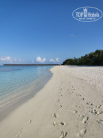 Он просто огромный. Обход острова по кромке океана по трекеру это почти 3.5 км. Сам остров сильно вытянут сверху вниз с севера на юг, и правая восточная сторона сильно отличается от левой западной. Потому что с правой стороны от острова на некотором расстоянии есть какой-то барьерный риф, отсекающий волны и задерживающий разную грязь. В итоге с правой восточной стороны нет волн, очень хороший заход в океан, а вода прозрачная чистая изумрудная, как в бассейне. На этом берегу находятся пляжные виллы, ветка водных вилл и самые лучшие front water виллы. А с левой стороны, где такого барьера нет - всегда волны, весь берег очень размыт, а вода часто мутная, и там расположены двух спальные виллы и виллы с джакузи.