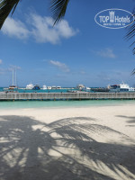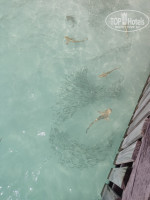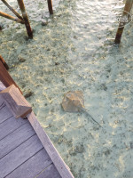 Водные виллы - тут опять есть нюансы. На острове две ветки водных вилл, и они сильно отличаются друг от друга, хотя на сайте отеля эти различия не описаны. Одна ветка находится с правой восточной стороны острова и доходит почти до барьерного рифа. Виллы расположены классически ёлочкой, с берега террасы не видны, выход в воду с террасы. Вторая ветка находится на верхней северной части острова, и она довольно странная, потому что виллы расположены не ёлочкой, а перпендикулярно пирсу и параллельно к берегу: правая часть ровно на восход, а левая часть - на закат. И поэтому с берега острова видно большинство террас, а из-за намытого берега первые виллы вообще смотрят фактически на берег. И самое главное, что у этих вилл спуск в воду не с террасы, а из туалета, что на мой взгляд довольно странно. В предыдущих отзывах писали, что у этой ветки лучше приватность, но со стороны я с этим не согласен, все террасы видны с берега, а у восточной ветки такого нет. Короче, заказывая водные виллы, имейте в виду, что они тоже бывают двух типов! С точки зрения водных обитателей - всё примерно одинаково, видели около всех водных вилл и скатов, и акул, и много других разных рыб, глубина там минимум по пояс, поэтому плавать с маской-трубкой можно с любых вилл, кроме самых первых. А по вечерам на террасе можно включить подсветку, тогда там будет аквариум, но тут наоборот, чем ближе к берегу, тем больше рыб будет около подсветки.