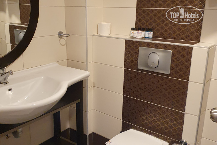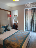 На мой взгляд отель 3-. Четыре маленький здания, плотно стоящих друг к другу. Мебель везде старая, на ресепшн старые кожаные диваны , продавленные попой. Жили в корпусе С. Номер от силы 10 кв метров. От стены до кровати полметра. Многое сломано, щели в дверях на балкон и на улицу, слышимость 90%. Мы как-будто на улице спали. Питание не очень. Горячее накладывает персонал. Есть немного мяса и курицы. 10 видов несъедобных салатов, пирожное не вкусное, фрукты, турецкий кофе в баре. Для 3* нормальное питание. Пляж клеопатра очень красивый. Но советую другой отель.