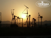 До пляжа ходил автобус, но мы на нём проехались только в последний день, до этого всегда ходили пешком. Идти по прямой 5-10 минут, зависит от скорости шага. Пейзаж, конечно не слишком красивый - пустыня и помойка. Зато, на обратном пути можно любоваться скалами на горизонте, они разноуровневые, и разного оттенка, как в компьютерной игре про Аладдина.