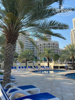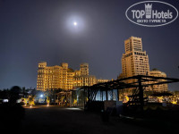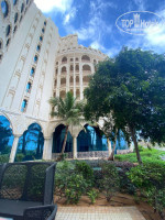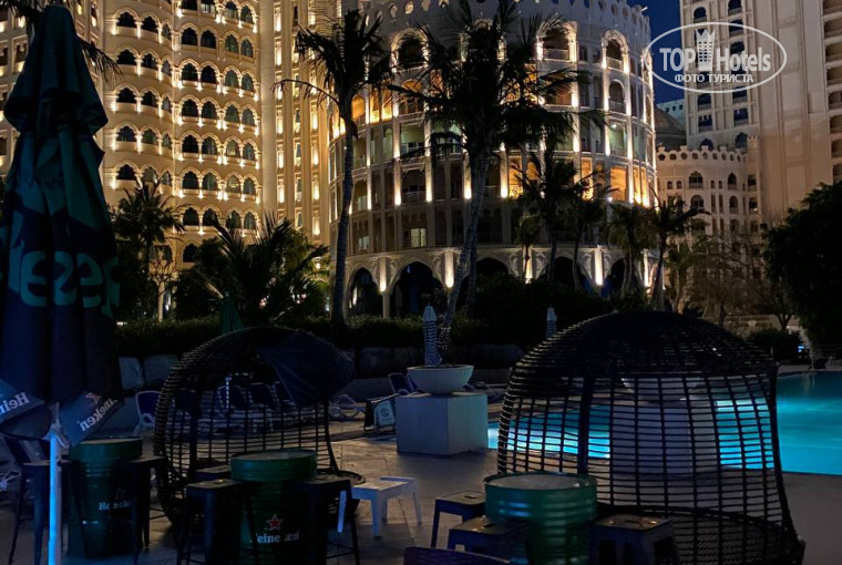 Территория не очень большая, но красивая, ухоженная, газон, птички - красота. На газоне можно поиграть с мячом (выдают на бассейне). Сам отель подсвечивается как на фото, прям арабская сказка. Стоит заметить, что отель занимает не все здание, а примерно треть, и на фото, где видно огромное строение с квадратной башней – это наш отель Al-Hamra, апартаменты и пятизвездочный отель Уолдорф в одном здании.