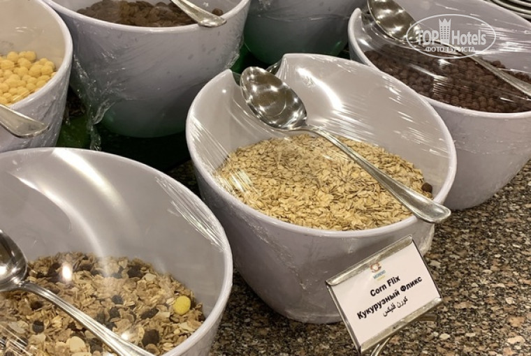 Небольшая, но вместительная, чистая, на улице тоже есть дополнительные места со столами и стульями, можно выбрать, где посидеть и поесть. На завтрак и обед простая сервировка столов, на ужин, каждый вечер новая, разные скатерти по цвету, тканевые салфетки, множество столовых приборов. Много посуды, всегда стоят чистые стопки тарелок разного размера, грязную, убирают официанты с подносами. Могут подойти спросить, что из напитков желаете и принесут. Из напитков: вино трёх видов, пиво, джин, текила, водка, юппи, спрайт, фант, кола и т.д. Читая отзывы о том, что не хватает еды, я честно говоря офигеваю!!!! Опишу то, что помню, многое даже попробовать не удалось, т.к., не влезало просто)) Завтрак: каша, тосты, блинчики с множеством джемов и варенек, мясная, сырная нарезка несколько видов, сыры типа творожного и домашнего, сл.масло, овощи, яичница и омлеты по желанию, просто отварные яйца, картофельное пюре, фасоль, мини сосиски куриные и говяжьи, йогурты, несколько видов хлопьев, фрукты, чай, кофе, соки и т.д., неужели этого мало??? Обед: что то из меню, каждый день новое! Супы, два вида, вкусные, паста, готовится при тебе, с соусом на выбор, жареная рыба или кальмары, повторюсь, пишу по памяти, то есть описываю весь ассортимент за неделю, тушёная говядина, ммммм пальчики оближешь, рис, лапша вог, жареные кабачки и баклажаны, куриная грудка, печень которые готовились на внутреннем гриле, картофельное пюре и по домашнему, фасоль, чечевица, курица фаршированная, роллы и это я не перечисляю овощи, салаты, и т.д. При этом всё красиво подано и расставлено, ходит человек, который следит за тем, что бы донесли то, что закончилось. Весь персонал в униформе и в перчатках, чистые и опрятные, с хорошим настроением! Редко видела у людей тарелки с верхом, как в других местах, т.к. люди знали, если доели, то можно подойти и спокойно взять ещё. Большой выбор хлеба, хлебные палочки, пироженки!!! На ужин всегда гриль, на улице, рыба или курица. Есть зона для принятия еды и стульчики, для детей. На территории находится Итальянский ресторанчик, записываться в баре на пляже, раз в пять дней, уютный, меню выбираете при записи, подача и обслуживание, на высоте, по вкусу, не дотягивают, разик сходить можно, надеюсь, что всё впереди и у них всё получится)))