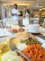 По основному ресторану, точнее столовке: конечно никаких креветок и приличных морепродуктов, есть какие то маринованные в салатах. Самый главный жирный минус - нет зоны на улице вообще! Даже рядом дешевый иберостар Белла виста с приятной уличной зоной ресторана в тени. И в иберостаре не было толп, очередей на завтрак (я заходила смотреть), были йогурты разных видов (у нас ни одного!) . Вечная толкучка в столовке, очереди, где что-то жарят всегда, от этой жаровни стоит дикий запах, а на улицу выйти никак. Два раза пол столовой было в дыму, в приличной одежде не хочется идти, выйдешь вонючим. Фрукты за полтора часа до окончания обеда или завтрака ужина заканчивались, про гуаву говорили финиш и все) . Соки разбавленные, никогда их не пила в столовой, так как вкус ужасный.