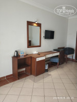 Номер после ремонта. В номере: сейф (бесплатно), телевизор (3 русских канала), зеркало, кондиционер (хорошо работал), шкаф, широкая 2-спальная кровать, письменный стол, холодильник, 4 тумбы, пуф, 2 кресла, журнальный стол, чайник с чашками (чай + кофе + сахар).