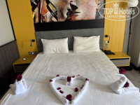 В отеле отдыхали с 16-25.06.2024 г.Заселили нас в 13.30 ,спасибо,что заселили пораньше.В отеле мало русскоговорящего персонала,это конечно минус.Номер у нас находился на 3 этаже с торца на бассейн.Уборка происходила каждый день,мини-бар пополняли своевременно.Еда здесь очень вкусная.Есть и жареное и на пару и детское меню.Каждый день как праздник!Единственное клубника и черешня была один раз.Море хорошее, но у берега убирают плохо,пройтись буквально 100 метров у соседнего отеля там заход чистый.А вот у лежаков убираются хорошо.Удивились,что нет развлечений на воде таблеток и бананов,приходится идти в соседние отели.На пляже ребята доброжелательные и внимательные. Трансфер до моря ходит каждые 10 минут.Автобус с открытыми окнами,что очень удобно и комфортно.Даже если в салоне 2 человека автобус везет на море, это очень классно.Наблюдали как в соседнем отеле автобус ходил каждые 30 минут и был всегда битком. Если не успели пообедать,то можно пообедать в снэк-баре у отеля или на море.Интернет тут хороший,ловит даже на море.Расстроило,что когда на пляже играли в волейбол,постоянно ограничивали во времени и были недовольны. На момент нашего приезда русских в отеле было всего 34 человека.