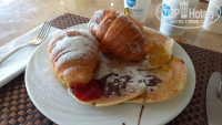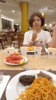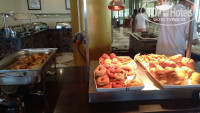 В ресторане очень много мест, столики стоят на разное количество мест, некоторые их сдвигают для большой компании. Официанты очень быстро все убирают со столов и раскладывают приборы. Посуда более-менее чистая, раза 2 попалась не отмытая до конца. Не могу сказать, что очень большой выбор еды, но мы голодными никогда не были. И повара готовят довольно вкусно. И что интересно, что здесь чай, кофе можешь пить во время любого приема пищи. Но мы чаще пили напитки типа Юпи. За колой со спрайтом всегда большая очередь, даже не за ними, а за алкоголем. Главное, всегда были вкусные фрукты: дыни, апельсины, грейпфруты, яблоки, бананы, финики, почти каждый вечер очень сладкий арбуз. Утром разнообразные вкусные булочки, круассаны и блинчики с пончиками, а также вафли. К ним много джемов и посыпок. За яичницей всегда очередь, поэтому мы без нее обошлись. В обед и ужин всегда курица, рыба, говядина, что-то приготовленное на гриле: колбаски, рыба, курица, утка, баранина, индейка. Несколько раз был ужин с морепродуктами (креветки, крабы, кальмары итд.), но кроме рыбы я ничего из этого не ем, поэтому эти вечера на любителя. Вечером на ужине можно угоститься мороженым в шариках, также детям интересен попкорн. Днем с 15 до 16 ч. выдают в баре у бассейна фасованное мороженое фруктовый лед от Нестле. Оно представлено в ассортименте и очень вкусное. Также где-то около пляжа можно пообедать фастфудом, но нам это было не интересно. В 16 ч на улице пекут пиццу, тоже не брали, т.к. столько есть просто невозможно. Рестораны алякарт есть, но они платные, поэтому мы туда не ходили.