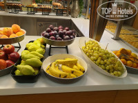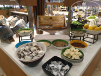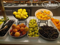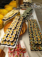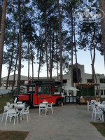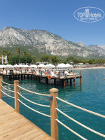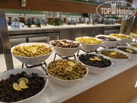 Разнообразная еда: супчики, мясо на гриле разное, тушеное, вареное, гарниры, закуски, фруктов всегда много на выбор:арбуз, дыня, яблоки, нектарины, персики, абрикосы, киви, виноград, бананы, инжир. Рыба жареная, на пару, красная соленая, салаты, овощи, омлеты, панкейки, вафли, хлопья - в общем выбор огромный на любой вкус. Свежевыжатый сок каждый день на завтрак. Главный ресторан с кондеем, но не всегда есть места, иной раз кушали на улице-не напрягало. Официанты приносят напитки, можешь сам сходить взять. Напитки в барах и по территории в холодильниках-вода, айран, лимонады.