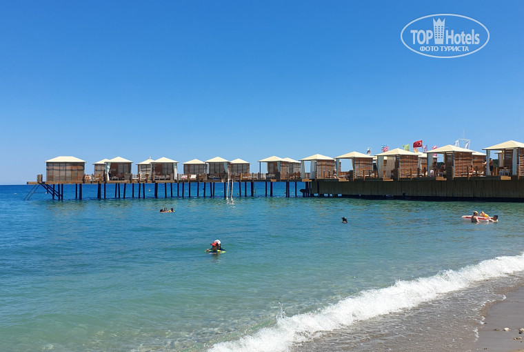 Вход в море камушки, в основном в тапочках заходят все, но есть и те, кому по кайфу массаж ступней-например мой муж) С понтона есть удобные спуски, сразу на глубину 4м. Везде душики с пресной водой, на понтонах, пляже, у бассейнов.
