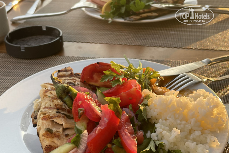 Еда хорошая, но ничего необычного. Один раз жарили рыбку на углях, два раза курицу на углях. В целом было разнообразие - курица, индейка, котлеты, овощи, холодные закуски, рыбка, рис вкуснейший и многое другое
