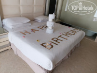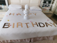 Поскольку мы были в отеле уже во второй раз, нас, как постоянных гостей, встретили в аэропорту на автомобиле и доставили прямо в отель. Огромное спасибо за организацию нашего отдыха сотруднику ресепшен Хусейну! Нам достался номер на третьем этаже с видом на море и оба бассейна. Поскольку во время нашего отдыха у нас были памятные даты (годовщина свадьбы и юбилей супруги), номер был украшен шарами, лепестками цветов и праздничной надписью на кровати.