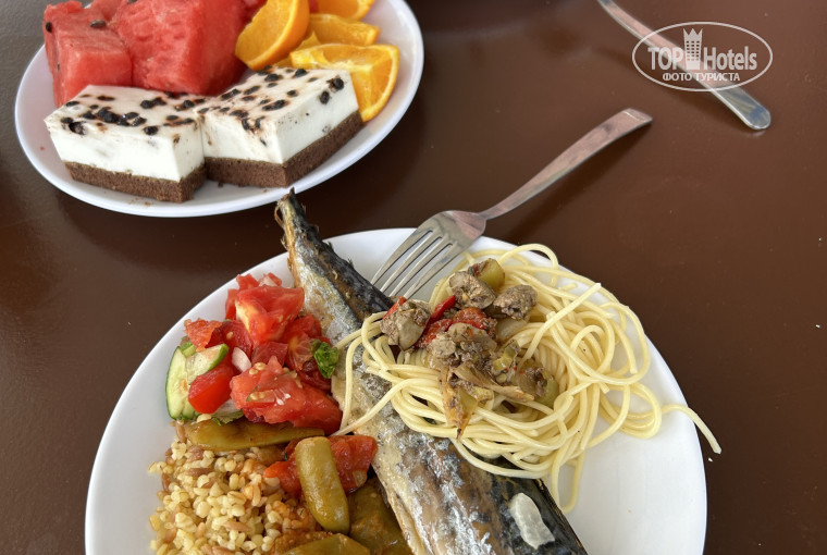 Питание очень даже неплохое. На завтраки всегда были вареные яйца, овсянка, свежие овощи, вареный картофель, хлопья с молоком, множество варенья, сыр, оливки, очень вкусный хлеб. Помимо этого на улице жарили омлет либо панкейки. Из фруктов всегда были арбуз и яблоки, часто сливы и под конец начали давать апельсины. Обед и ужин каждый день комбинировали. Из того, что помню: куриные ножки, бедра, филе, печень, желудочки, наггетсы, котлеты и люля (скорее всего из сои), мелкая рыбешка, под конец нашего отдыха подавали вкусную скумбрию, а на гарнир рис, булгур, макароны, тушеные овощи. Также много свежих овощей, сыра, соусов. Голодными точно не останетесь, есть что выбрать, даже если ничего не нравится. Разнообразные десерты и почти все вкусные. На баре пиво (вкусное), белое и красное вино (совсем не очень). Лучше брать с собой пластиковые стаканчики и ходить с ними везде, чтобы быть уверенным в чистоте и наличии)