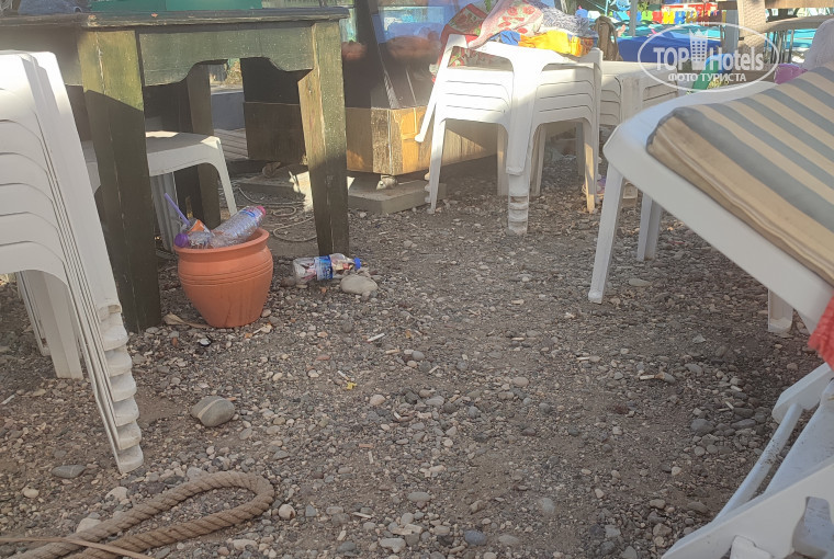 Прикрепляю фото, сделанное около 10 утра, 1/3 лежаков "заняты", но стоят пустые. Матрасы мокрые и грязные. На пляже кафе, где варят раков, по пляжу раскиданы остатки клешней и грязь кругом, ощущение, что не убирают вообще, очень много мух.