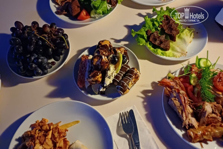 В 12 пошли на обед, Шведский стол - выбор блюд разнообразный, голодными не остались. Из представленного разнообразия еды, старались брать умеренными порциями, чтобы все попробовать, в отличии от других гостей отеля, который набирали еду "тазиками" и оставляли её недоеденной!!! Так же был полдник с печенюшками))) Ужин так же шведский стол - помидоры, огурцы, салаты несколько видов, яблоки, сливы, виноград, соусы, оливки несколько видов, зелень (петрушка, укроп, мята, шпинат, листовой салат), наггетсы, рис, картофельное пюре, картошки фри, лепешки с разными начинками, три дня была рыба, котлетки из говядины или индейки, на десерт бисквитные пирожные и торты. После ужина была развлекательная шоу-программа - Караоке, файер-шоу, танец живота, и конечно же дискотека, жаль только до 23.00. Музыка была на любой вкус и цвет. Можно было заказывать любую песню. Все заявки исполнялись.