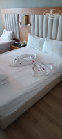 Море чудесное, погода хорошая, вид на горы потрясающий! Сам отель, конечно, не очень понравился. Выглядит запущенным. Прибыли в 6 утра, заселили в 14.00, но это норма, доплачивать 45 баксов не стали, подождали. Номер дали на втором этаже, с большим балконом и видом на бассейн и море. Комната неплохая, но санузел уже требует ремонта, очень старое всё, но работало исправно. Очень хорошо ловил вайфай в номере без перебоев. Кондиционер слабо дул, и что-то отключался сам по себе, бесило немного. Уборка в номере каждый день, но без фанатизма. В телевизоре есть немного русских каналов, можно подключить флешку. Питание понравилось, приготовлено вкусно. На пляже тоже вкусно кормили, особенно рыба, в этот раз даже лепешки не брали, были сытые и без них. Алкоголь стандартный местный. Конечно, коктейли делают отвратные, ни один не зашёл. Иногда пили виски и Бейлис ликёр, ещё вино розовое можно пить. Но это на наш вкус. Мороженое тоже хорошее. Понравился пирс, очень много шезлонгов, места есть всегда, а вот на пляже нужно с утра занимать, позже всё занято. Бассейны чистые, но уже прохладные были, из трёх горок работало две, но нам хватило и их. Анимация так себе, вечерами делать нечего. Абдулла вообще парень прикольный, посетили один раз вечером конкурс пара отеля, наржались от души. Ну и аквааэробику пару раз посетила. Для молодёжи скучно будет, но есть вывоз желающих на дискотеку. Хотя что мешает устроить её в отеле? Я думаю многие бы потанцевали, а то тупо сидят и выпивают. Зато из соседнего отеля музыка орет и караоке поют, немного завидно даже было) Очень понравилось расположение в отеле перехода, по солнцу не нужно идти к морю, ну и близко очень, это плюс. Ну а теперь то что очень не понравилось-это грязные столы в ресторане, их протирают только один раз к открытию, а далее всем пофиг что на столе творится. Хотя работники постоянно бегают, собирают, что-то метут, но протереть стол видимо инструкции нет. Это отвратительно. Ещё нам вечно не хватало вилок и тарелок, их просто не было на месте. Мы кушать всегда ходим ближе к концу, меньше народу, но с посудой напряг. Но и,конечно, самое вкусное разбирали и не всегда пополняли, ну да ладно, хватало еды. Толпиться в очереди перед открытием это не для нас. Посуда грязная не попадалась, а вот стаканы в баре пластиковые и мутные. Территория отеля небольшая, но ухоженная, зелени не много. Ещё очень затертый, грязный ковролин в коридорах. Для детей ничего интересного в отеле нет, будет скучно. Все вышеперечисленные недостатки не омрачили нашего отдыха, впечатления остались самые наилучшие, в следующий раз как всегда, поедем в другое место за новыми эмоциями. Мы отдохнули в этом отеле, как выяснилось, не так уж и дорого, 254 тысячи на троих взрослых за 10 ночей. Дороже этот отель не стоит. За недорого рекомендую отдохнуть, но обязательно с собой хорошее настроение и море позитива! Всем хорошего отдыха!