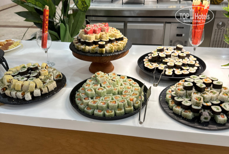 Питание в отеле в основном происходит в главном ресторане все стандартно для отеля этого уровня голодным остаться не возможно, можно на обед ходить в алякарты по меню работало 2 ресторана, также есть фудтрак с лепешками, шаурмой и фруктами. Мясо, рыба в любом виде всегда ,фрукты яблоки, груши, виноград ,мандарины, дыня, слива ,апельсины. В этом отеле всё расположено в одном месте далеко ходить не надо пляж-ресторан-бассейны-алякарты-бары-фудтрак-СПА рядом друг с другом это очень удобно и большой плюс отелю!!!