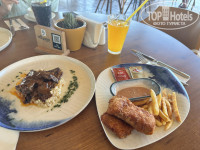 Прибыли в отель в 10 ч. утра оставили чемоданы на ресепшен переоделись и пошли на пляж . До поездки уже было все изучено в интернете про отель) и мы знали где что когда за ранее и навигационных проблем не испытывали . Пообедали в алякарте по меню, который часто посещали в течение отдыха , меню не менялось суп чечевичный вкусный , баранина на гриле вкусная , фишчипс рыба в кляре тоже вкусная, также там пиццы салаты, десерты, в 10 метрах от него тихий бар всегда без людей и очередей, но не с полной картой напитков. К 14 ч подошли на ресепшен попросили номер на 2 этаже, тк читали якобы муравьи атакуют первые этажи, дали без вопросов 2 этаж и доставили с вещами на машинке до номера (муравьев так и не видел за все время на улице, не то что в номере).