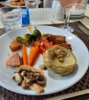 Есть основной с залом и двумя террасами. Лобби-бар (только напитки), брасери "Кос" под террасой ресторана вдоль пляжа (еда и напитки), ещё бар за бассейном и бар English Pub "на палубе" (фото с неё я вам в комментарии ставила) — круглосуточный, над основным рестораном, рядом с ресторанами а-ля карт.