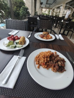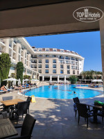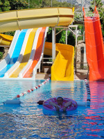 После размещения мы начали осваивать территорию. Оказалось что не смотря на компактность территории все очень гармонично расположено, Возле большого бассейна расположен бар и столики, А вот с другой стороны здания есть бассейн с горками.амфитеатр, кафе мороженое, бар со столиками, кофейня,