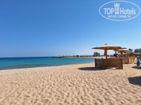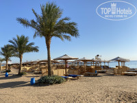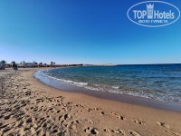 3. ПЛЯЖ. Пляж - это то, из-за чего отелю можно простить все недочеты. Лежаки деревянные, с матрасами. Не новые, но в хорошем состоянии. Есть зонтики от солнца. И, что очень важно для отдыха в зимнее время и ранней весной, ширмы, защищающие от ветра. Вход в воду песчаный, комфортный. Многие (в том числе и мы) не использовали специальную обувь, хотя в Египте рекомендуют купаться в ней не только на коралловых, но и на песчаных пляжах. На территории, огороженной буйками и предназначенной для купания, есть небольшие рифы с рыбками. Кому-то повезло даже увидеть ската. Риф побольше расположен справа от пляжа. Для купания в этом месте обязательна специальная обувь, о чем предупреждает табличка на берегу. Слева от пляжа расположена станция виндсерфинга.